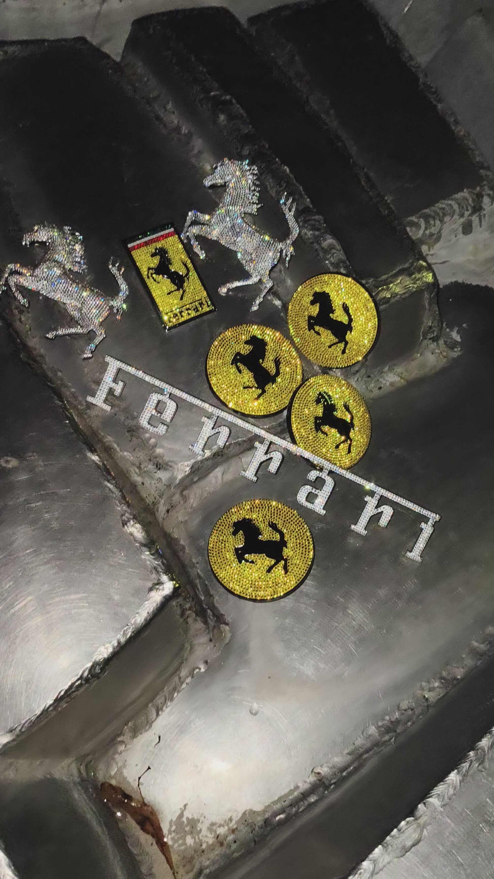 Genuine Ferrari OEM logo emblem set, front and rear. Embellished with genuine Preciosa® crystals. Fits all Ferrari models, for example: Daytona